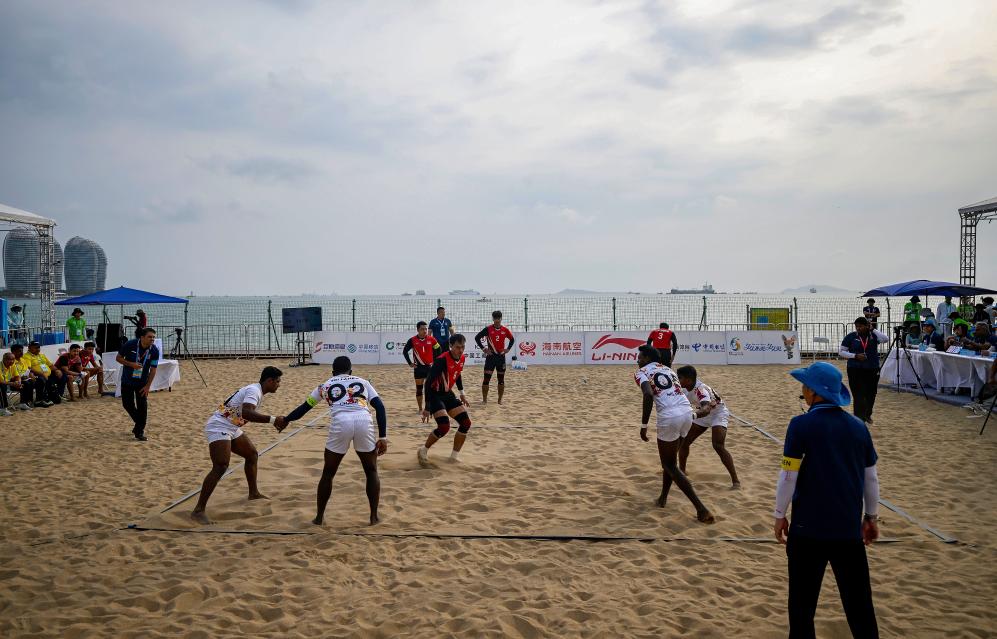 4月23日,斯里兰卡队和泰国队选手在沙滩卡巴迪男子小组赛中。新华社记者 赵子硕 摄